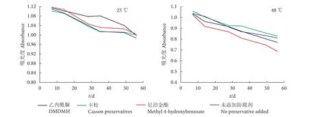 将3份质量分数0.05%的MAAs水溶液分别加入卡松 (质量分数为0.3%)、尼泊金甲酯 (质量分数为0.3%)、DMDMH (质量分数为0.3%),再分成2份后,分别置于25和48 ℃下56 d,定期取样测试其在334 nm处的吸光度。