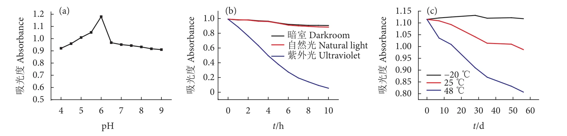 图4-a为pH对坛紫菜MAAs化合物吸光度的影响。坛紫菜MAAs化合物在微酸性 (pH=6) 下具有最大的吸光度,说明此条件下坛紫菜MAAs化合物的浓度最高、稳定性最好。在酸性和碱性条件下稳定下较差,随着酸度或碱度的增大,吸光度逐渐下降,说明稳定性也不断下降。因此,在储存和制备MAAs化合物时应尽量避免过酸或过碱的环境,以保证MAAs化合物的稳定存在。