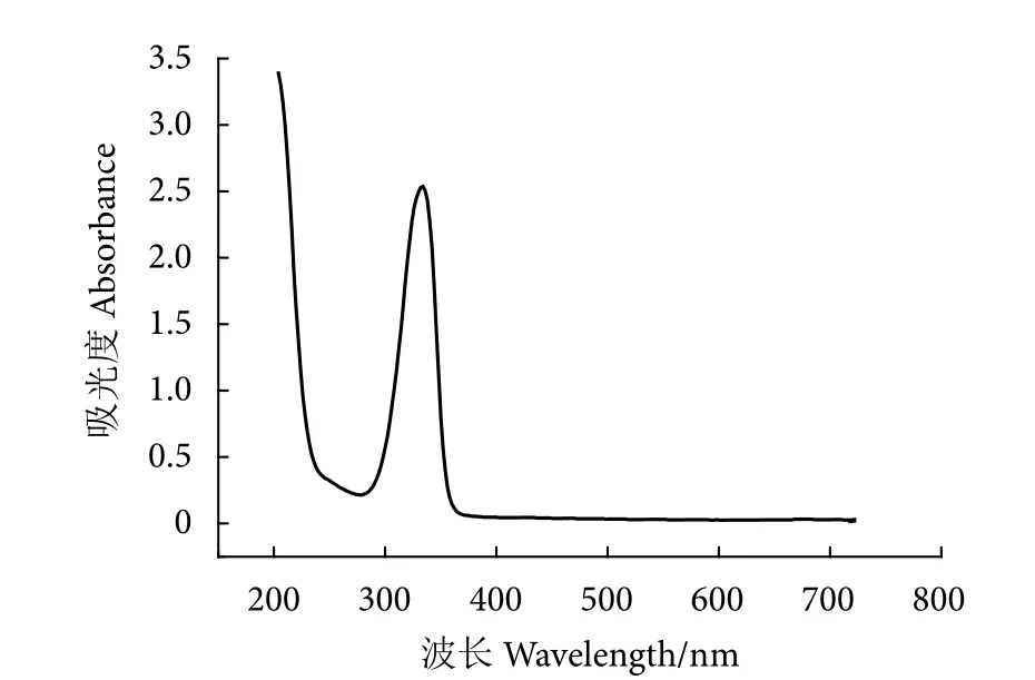 MAAs的定性一般是通过MAAs的特征吸收波长来初步判断。图1为坛紫菜提取液于波长200~780 nm处的扫描图谱。可以看出,提取液的紫外最大吸收波长λmax=334 nm。MAAs化合物中Porphyra-334和Shionrine两者的最大吸收波长均为λmax=334 nm[31],由此可推测坛紫菜中含有的MAAs化合物可能为Porphyra-334和Shionrine。由于所提取的粗产品没有经过进一步的纯化,可能含有色素等杂质,因此在200 nm处出现1个吸收峰。