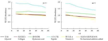 将5份质量分数为0.05%的MAAs水溶液 (含质量分数0.2%卡松、防腐剂) 分别加入不同功能性添加剂透明质酸 (质量分数为0.2%)、甘油 (质量分数为8%)、胶原蛋白 (质量分数为0.2%)、小分子肽 (质量分数为0.2%)、维生素A (质量分数为0.2%),再分成2份后,分别置于25和48 ℃下56 d,定期取样测试其在334 nm处的吸光度。