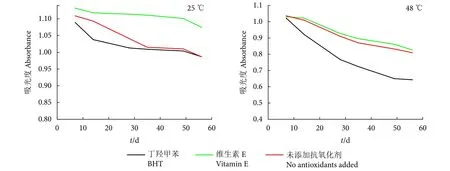 将2份质量分数为0.05%的MAAs水溶液 (含质量分数0.2%卡松) 分别加入不同抗氧化剂BHT(质量分数为 0.3%) 和维生素 E (质量分数为0.3%),再分成2份后,分别置于25和48 ℃下56 d,定期取样测试其在334 nm处的吸光度。