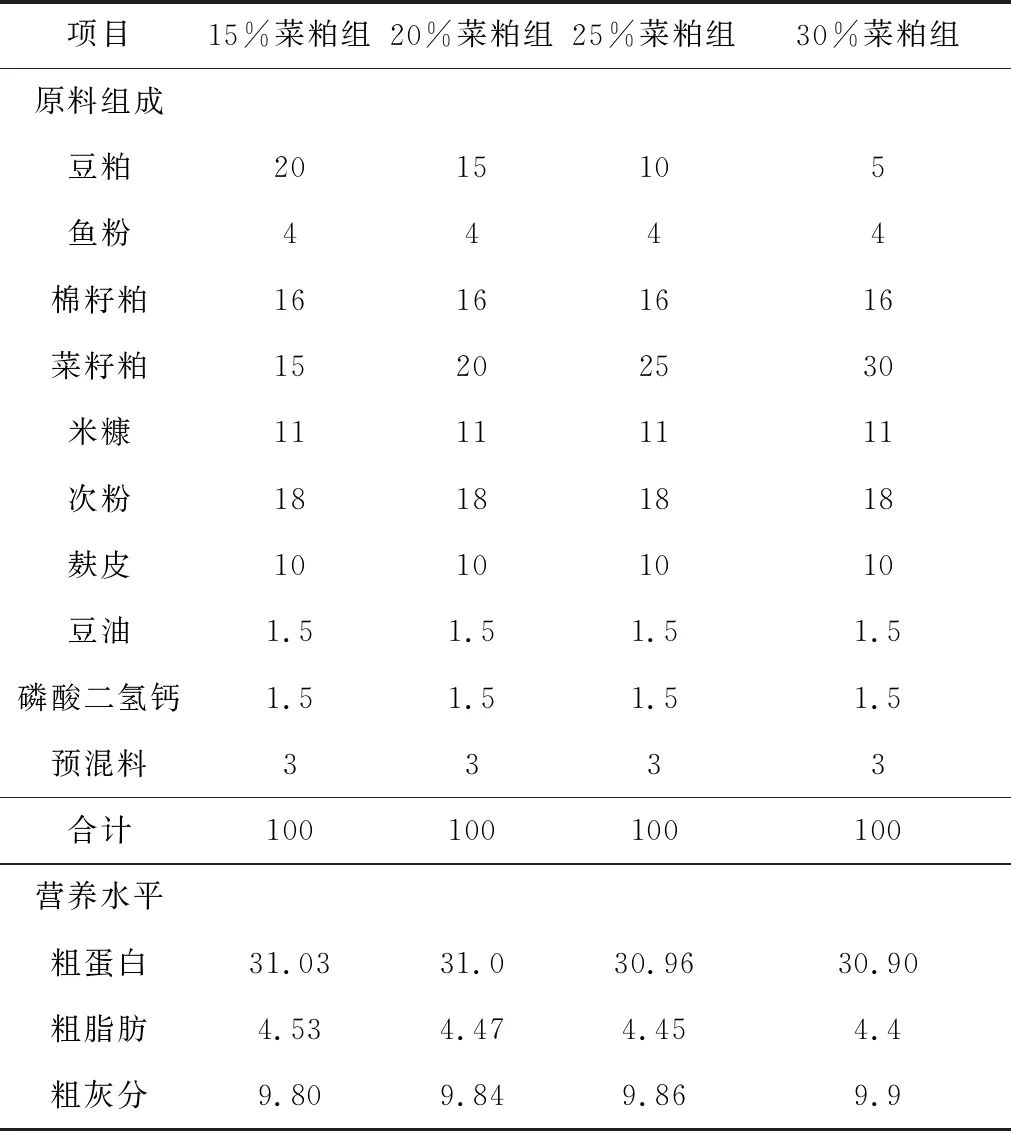 试验中,配置4种不同水平菜粕的试验饲料,菜粕含量分别为15%、20%、25%、30%,4种试验饲料等能等氮。试验所用的各种饲料原料经粉碎机粉碎后,过40目筛,按照比例均匀混合,再使用颗粒机制成直径为1.5mm的颗粒饲料,经65℃烘箱烘干后,于4℃冰箱保存备用。