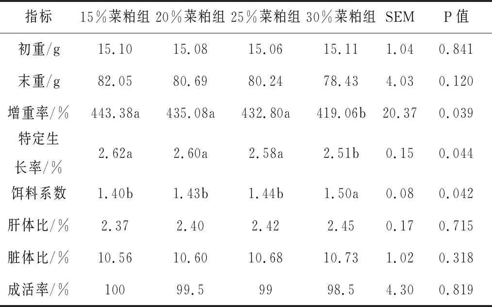 表2 不同水平的菜粕含量对草鱼生长性能的影响