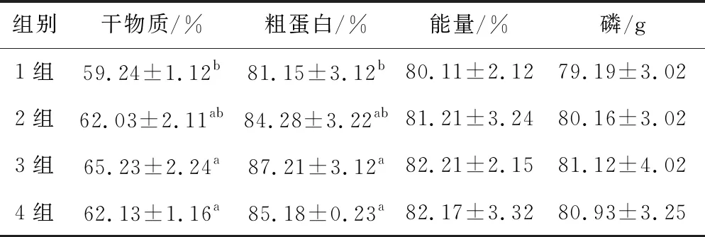 每个试验组鲫粪便中的养分消化率指标结果由表3可知,试验2、3、4组鲫的粪便中的能量、磷等营养物质的消化率均高于1组(P>0.05);试验2、3、4组鲫的粪便中的粗蛋白质、干物质等营养物质的消化率均高于1组,其中试验2组鲫的粪便中的粗蛋白质、干物质等营养物质的消化率均高于1组(P>0.05),试验3、4组鲫的粪便中的粗蛋白质、干物质等营养物质的消化率显著高于1组(P<0.05),试验2、3、4组鲫的粪便中的粗蛋白质、干物质等营养物质的消化率之间相比差异性不显著(P>0.05)。