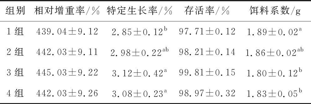 饲养结果由表2可知,试验2、3、4组的鲫在饲养试验过程中的相对增重率和存活率高于1组(P>0.05),试验2、3、4组鲫的特定生长率均高于1组,试验2组高于1组(P>0.05),试验3、4组显著高于1组(P<0.05),试验2、3、4组的特定生长率之间相比差异性不显著(P>0.05);试验2、3、4组鲫饵料系数比均低于1组,试验2组鲫饵料系数比低于1组(P>0.05),试验3、4组饵料系数显著低于1组(P<0.05),试验2、3、4组相比差异性不显著(P>0.05)。