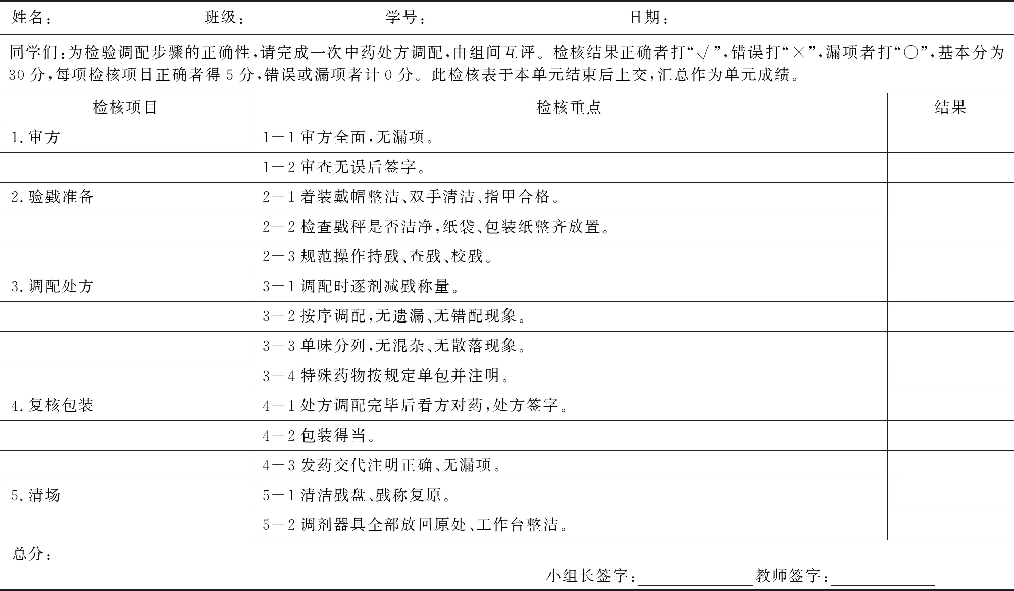 3.6.2 实作评量尺规表的构成要素:评量尺规表通常包括实作表名称、学生信息、指导语、评量项目、评量主体、评量标准、评定结果、备注或注意事项,以及签名和日期等信息。各部分信息的内涵如下:1)实作表名称应切合实作主体,应明示检核表或评量表。2)学生信息包括学生姓名、性别、班级、学号等。3)指导语是包括引导句、目的、做法、评量结果方式、历程及用途六部分,引导句是指问候语或引导评量的必要说明;目的是表述实作目标;做法是如何评分;评量结果方式是告知受评者评定检核结果的标示方式,如小组互评、教师评价等;历程是准备或实作的历程;用途是完成评量结果的用途。如表1中的指导语的包含因素为:为检验调配步骤的正确性(目的),请完成一次中药处方调配(历程),由组间互评(评量结果方式)。检核结果正确者打“√”,错误打“×”,漏项者打“○”,基本分为30分,每项检核项目正确者得5分,错误或漏项者计0分(做法)。此检核表于该单元结束后上交,汇总作为单元成绩(用途)。4)评量项目即实作层面与实际指标,即评量标准中的评量向度,即表1中的检核项目及检核重点,表2中的评量项目。5)评量主体即检核者,可以兼顾教师、学生、家长、企业指导教师等,实现多方共同参与评量。6)评定结果是打分数或评等级,可以采取多元评定结果,以鼓励表现较差学生,常用方式如下:①加符号的等级:在等级旁加注“+”、“-”或“上”、“下”,“+”、“上”代表用心或进步,符号越多代表越用心、越进步,“-”、“下”则代表不用心或退步,符号越多代表越不用心、越退步。②加评语的分数:教师在打分数后,对学生的努力程度或特殊情况给予适当的鼓励或提示,会具有更积极意义,如很好、不错、加油、改善等评语。6)备注或注意事项是用于补充其他信息不足之处,具有一定弹性,如涉及实作安全时,可警示学生注意安全,减少意外。