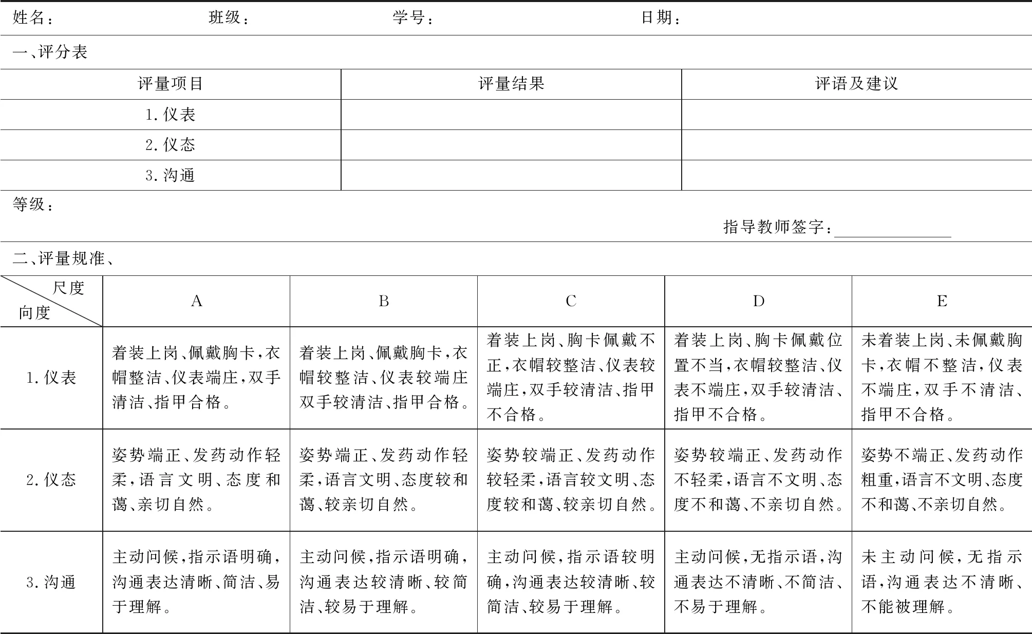 以表2“《发药服务礼仪》实作评量表”为例说明上述要素,向度为仪表、仪态和沟通;评量尺度为A、B、C、D、E五级;各级均有各个向度的操作性定义,即向度描述,如仪表的A级为着装上岗、佩戴胸卡,衣帽整洁、仪表端庄,双手清洁、指甲合格。B级为着装上岗、佩戴胸卡,衣帽较整洁、仪表较端庄,双手较清洁、指甲合格。
