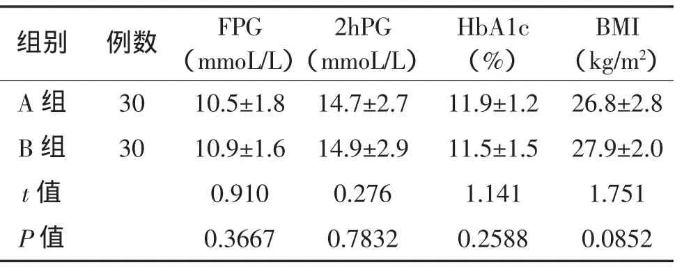 组别 例数 FPG(mmoL/L)BMI(kg/m2)A 组 30 10.5±1.8 14.7±2.7 11.9±1.2 26.8±2.8 B 组 30 10.9±1.6 14.9±2.9 11.5±1.5 27.9±2.0 t值 0.910 0.276 1.141 1.751 P值 0.3667 0.7832 0.2588 0.08522hPG(mmoL/L)HbA1c(%)