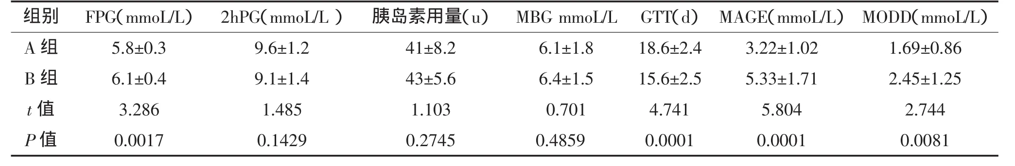 1.2 方法 患者入院后均予糖尿病知识宣教,指导糖尿病饮食,予优泌乐50(礼来公司),两组胰岛素用量按每天0.4/kg开始,A 组每日 3 次(分配比例早∶中∶晚=2∶2∶1),B 组每日 2 次(分配比例早∶晚=3∶2)。治疗期间均采用糖博士血糖仪监测空腹血糖(FPG)、餐后两小时血糖(2hPG)和睡前21:00点血糖。根据血糖结果调整胰岛素用量,以空腹血糖4.0~7.0mmoL/L,三餐后2hPG 4.0~11.1mmoL/L为血糖达标。有明显低血糖症状如出冷汗,心悸等,或血糖<4.0mmol/L定义为低血糖。末梢血糖监测达标后,给予72小时动态血糖监测仪,按操作规程佩戴监测,数据采用专用软件分析系统(CGMS3.0)进行分析。评估指数:平均血糖水平(MBG)、血糖达标时间(GTT)、日平均血糖漂移幅度(MAGE)、日间血糖平均绝对差(MODD)以及低血糖时间百分比。动态血糖仪采用美敦力公司生产的CGMS。