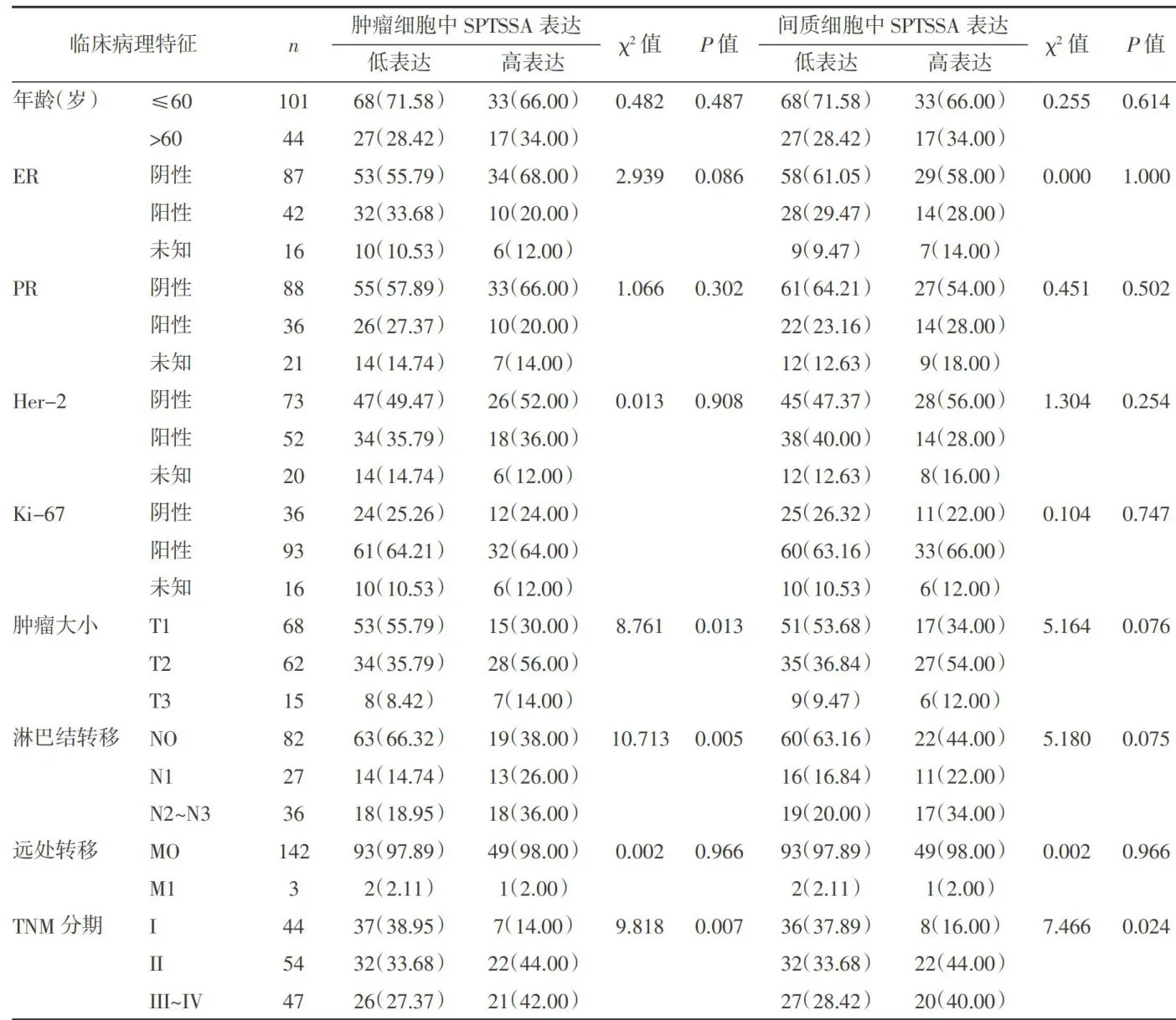表1SPTSSA蛋白表达与乳腺癌临床病理特征的关系 n(%)