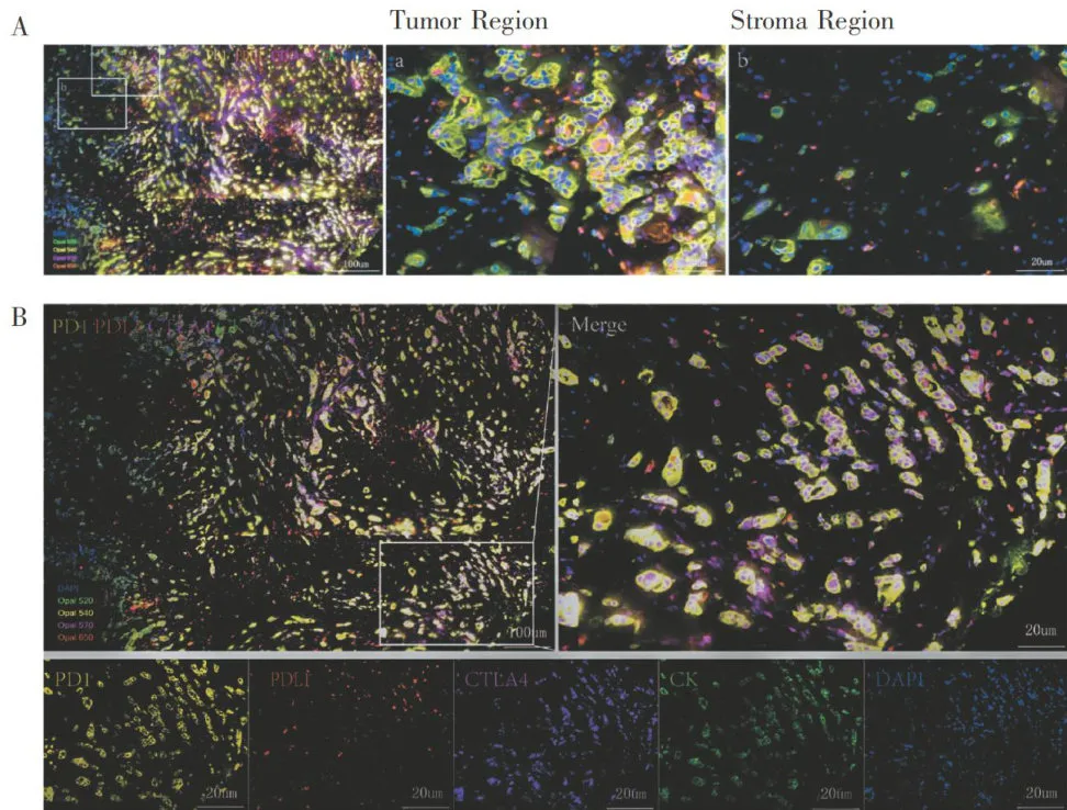 1.3乳腺癌组织芯片制作采用微阵列技术构建乳腺癌组织和癌旁组织芯片,将组织样本固定在多孔载玻片上,切片厚度为 5μm 。组织微阵列(tissuemicroarray,TMA)以直径 2mm 的样本核心形式呈现。1.4多重免疫组织化学染色乳腺癌TMA切片于70% 烘片 1h ,经二甲苯震荡脱蜡 6min ,依次在不同浓度乙醇水化各 5min ,超纯水冲洗后, 10% 甲醛溶液固定 10min ,再用超纯水冲洗。按1:100稀释柠檬酸抗原修复液,加热修复后冷却,先后经超纯水、TBST冲洗。圈定样本区域,封闭 10min ,抗SPTSSA单克隆抗体1:800稀释后 4∘C 过夜。后续经TBST冲洗、二抗孵育、染料工作液孵育等操作。若染多种抗体需重复相关步骤,单染则封片前修复。最后DAPI染色封片,采用Vectra3.0成像,软件分析评分,依5年生存时间确定SPTSSA截断值分组。一抗:抗SPTSSA(1:800);抗细胞角蛋白(CK)抗体(1:4000,orb 69073,Biobyt,英国);抗CD3抗体 (1:800,85061s,CS′ T,美国);抗CD4抗体 (1:400,ab133616 ,美国);抗CD8抗体 (1:800,85336,CST ,美国);抗CD20抗体 (1:400,ab78237,Abcam. ,美国);抗CD66b抗体(1:400,arg66287,Arigo,中国);抗CD68抗体(1:400,76437s,CST,美国);抗CD86抗体(1:400,orb388891,Biorbyt,英国);抗CD163抗体 (1:200,93498s,CS] r,美国);抗LAMP3抗体(1:400,orb1433531,Biorbyt,美国);抗PD1抗体(1:200,13684T,美国);抗PD-L1抗体(1:200,18616s,CST,美国);抗CTLA-4抗体(1:200,orb527271,Biorbyt,英国)。