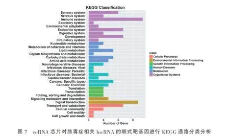 2.4对脓毒症相关lncRNA的顺式靶基因进行KEGG通路分类分析基于ceRNA芯片对脓毒症相关lncRNA的顺式靶基因进行KEGG通路分类分析,结果显示这些靶基因主要参与以下六大功能模块:在细胞过程中显著富集于运输与分解代谢通路;在环境信息处理方面主要涉及信号转导过程;在遗传信息处理中主要参与翻译调控;在人类疾病方面与特定类型癌症相关通路存在显著关联;在代谢过程中主要调控脂质代谢;在机体系统方面则显著富集于免疫系统相关通路。这些发现揭示了脓毒症中LncR-NA可能通过顺式调控作用影响多个关键生物学通路,特别是免疫调节和代谢重编程过程,为深入理解脓毒症的发病机制提供了新的分子视角。见图7。