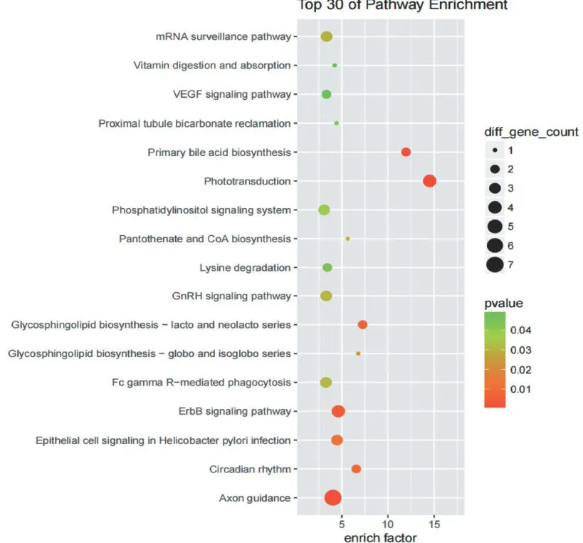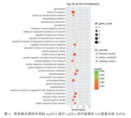 基于ceRNA芯片对脓毒症相关lncRNA的顺式靶基因进行KEGG通路富集分析,选取Top30显著富集的信号通路进行深人解析。研究发现,轴突导向和光传导等神经相关通路表现出显著富集特征。这些结果表明,在脓毒症病理过程中IncRNA可能通过顺式调控机制参与神经信号传导和感觉信息处理等生物学过程,提示神经系统调控可能在脓毒症的全身炎症反应中发挥重要作用,为探索脓毒症多器官功能障碍的分子机制提供了新的研究方向。见图8。