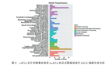 2.5ceRNA芯片对脓毒症相关lncRNA的反式靶基因进行KEGG通路分类分析基于ceRNA芯片对脓毒症相关IncRNA的反式靶基因进行KEGG通路分类分析,结果显示这些靶基因主要参与以下功能模块:在细胞过程中显著富集于运输与分解代谢通路;在环境信息处理方面主要参与信号转导过程;在遗传信息处中主要涉及蛋白质折叠、分选和降解;在人类疾病方面与特定类型癌症相关通路存在显著关联;在代谢过程中主要调控脂质代谢;在机体系统方面则显著富集于免疫系统相关通路。这些发现表明,脓毒症中IncRNA可能通过反式调控作用影响多个关键生物学过程,特别是免疫应答和代谢调控网络,为深人解析脓毒症的分子机制提供了新的理论依据。见图9。