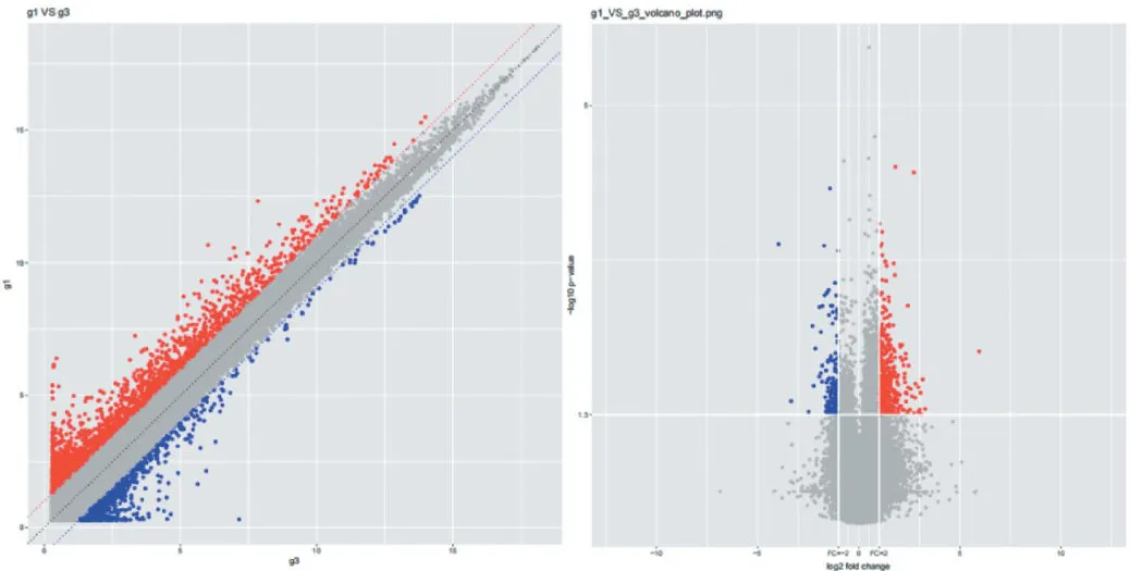 图1lncRNA散点图和火山图