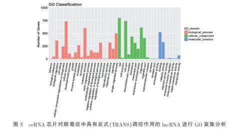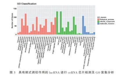 2.3对脓毒症中具有反式调控作用的lncRNA进行GO富集分析通过ceRNA芯片对脓毒症中具有反式(trans)调控作用的IncRNA进行GO富集分析,结果显示这些IncRNA在生物过程方面显著富集于细胞过程和代谢过程;在细胞组分方面主要分布于细胞、细胞部分和细胞器;而在分子功能方面则主要涉及结合和催化活性。表明脓毒症中具有反式调控作用的lncRNA可能通过参与细胞基本生命活动、调控代谢过程以及与蛋白质或核酸结合或发挥酶活性等方式,在疾病的发生发展中发挥重要作用。见图5。