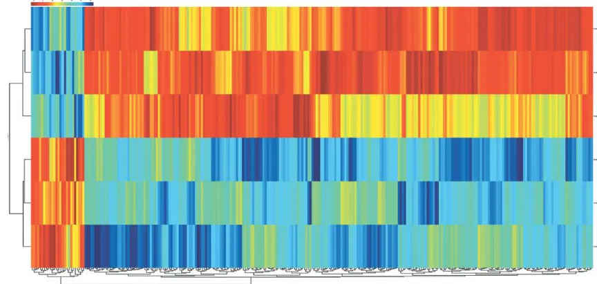 左图,X轴:探针点在对照芯片中标准化后的信号值。Y轴:探针点在样品芯片中标准化后的信号值。落在图形中 y=x 直线(图上中位线)上的点代表这个探针点在两张芯片中信号值差异Fold Chang :=1 ,落在图形中位线两侧45度线之外的点代表这个探针点在两张芯片中信号值差异Fold Changegt;2。右图,X轴:Log2(Fold Change),Y轴: -Log10(P 值)。X轴平行线 :P 值 =0.05,Y 轴平行线:Fold Change :=2 ;红色区域: P 值 lt;0.05 Fold Change ⩾2 的差异基因;绿色区域: P 值 lt;0.05 、Fold Change ⩽0.5 的差异基因。
