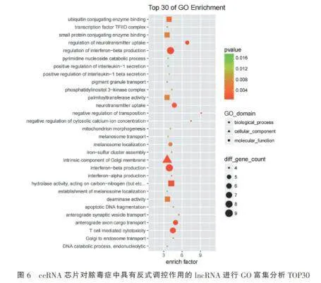 通过对脓毒症中具有反式调控作用的lncRNA进行ceRNA芯片检测及GO富集分析,选取Top30显著富集通路进行深入解析。结果显示,这些lncR-NA主要参与调控多种生物过程,其中最为显著的是参与干扰素β产生的调节和干扰素β产生。在细胞组分方面,这些lncRNA显著富集于高尔基体膜内在成分等亚细胞结构。表明脓毒症中具有反式调控作用的lncRNA可能通过调节干扰素 β 等关键免疫因子的产生,并靶向高尔基体等细胞器,在宿主免疫应答和炎症反应调控中发挥重要作用。见图6。