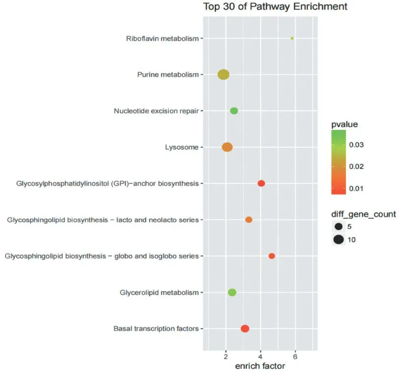 通过对脓毒症相关IncRNA的反式靶基因进行KEGG通路富集分析,选取Top30显著富集的信号通路进行深入研究。结果显示,基础转录因子和糖基磷脂酰肌醇锚定生物合成等通路表现出显著富集特征。表明在脓毒症病理过程中IncRNA可能通过反式调控机制影响基因转录起始和蛋白质膜锚定修饰等关键生物学过程,为深入理解脓毒症中基因表达调控异常和细胞膜功能紊乱的分子机制提供了新的研究方向。见图10。