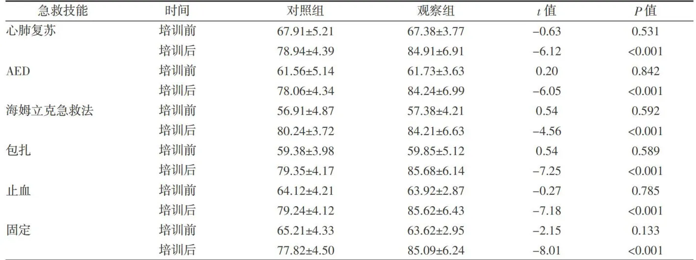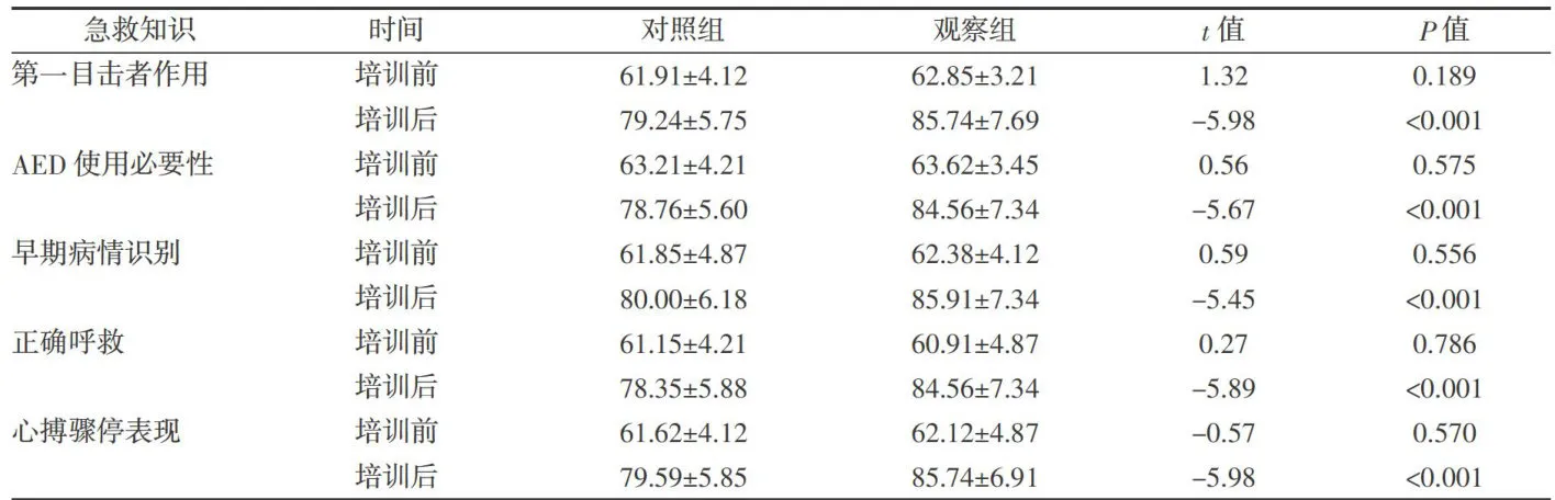 2.1两组受训者急救知识掌握程度比较 培训前两组受训者急救知识掌握程度差异无统计学意义中 Pgt;0.05 ,培训后两组受训者急救知识掌握程度均较培训前提升,且观察组掌握程度明显高于对照组,差异均有统计学意义( Plt;0.05 。见表2。