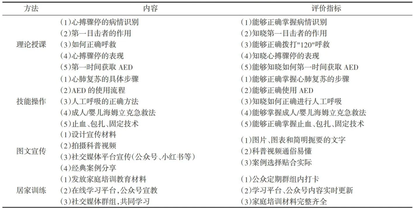 1.2急救技能培训对照组:采用传统教学方法,即理论授课 ⋅+ 实际操作演练。观察组:通过“同心圆”论域下急救体系进行急救技能培训。“同心圆"论域下的公众急救技能培训以专业的急救团队为圆心,延长半径自内而外分别为非急救专业的医护人员、猝死高风险患者照护家属、公众。培训内容及评价指标见表1。(1)体系架构:核心层(圆心):由5名美国心脏协会(AmericanHeartAssociation,AHA)认证的急救专家(急诊工作 ⩾5 年,护师以上职称)组成导师团队,负责课程设计、质量把控及骨干培训。中间层(内圈):社区卫生中心非急诊医护人员,通过“ 1+ 2"帮带模式(1名导师培训2名医护人员)强化教学能力;高风险群体如心源性猝死患者直系家属,提供每月1次的情景化培训(包括家庭急救箱使用、夜间突发状况应对等)。外围层(外圈):为普通公众,重点行业组(教师、公交司机等)侧重群体事件应急处理,社区组开展“邻里守护"结对练习。(2)优化培训内容:梯度化知识传递,核心层以高级生命支持为重点,强化团队协调指挥能力;中间层以疾病预警识别为重点,优化家庭急救流程;外围层强调CPR/自动体外除颤器(automated external defibrillator,AED)单兵操作。(3)质量控制系统:核心层进行高级生命支持(advanced cardiac life support,ACLS)技能复测;中间层完成家庭应急演练视频打卡;外围层进行社区模拟考核。