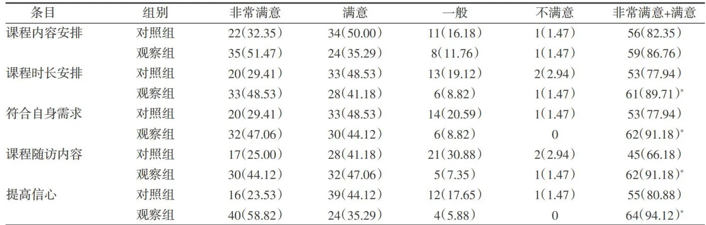 2.3两组受训者对培训模式满意度比较观察组受训者对课程时长安排、符合自身需求、课程随访内容及提高信心方面的满意度高于对照组,差异均有统计学意义( (Plt;0.05) ,但两组对课程内容安排的满意度比较,差异无统计学意义( (Pgt;0.05) )。见表4。