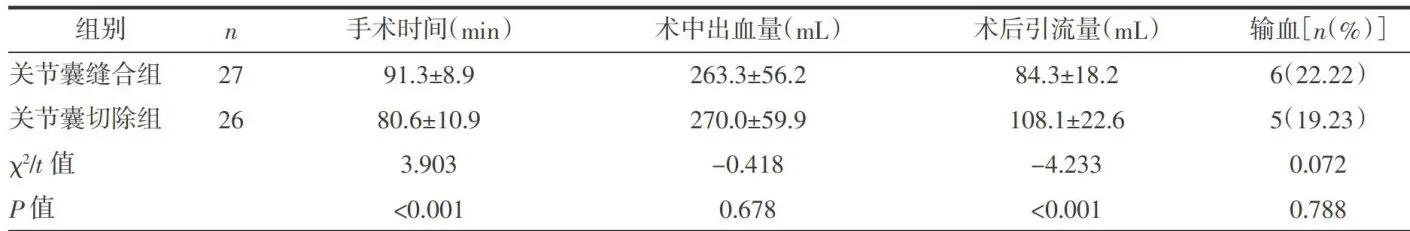 2.1两组患者手术指标比较关节囊缝合组术后引流量少于关节囊切除组,手术时间长于关节囊切除组(均 Plt;0.05 )。两组术中出血量、输血率比较,差异均无统计学意义( Pgt;0.05 )。见表1。
