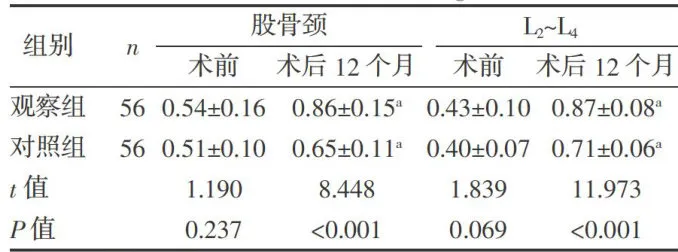 2.5两组骨密度比较两组术前股骨颈 .L2~L4 骨密度比较,差异均无统计学意义( (Pgt;0.05) )。术后12个月两组股骨颈 .L2~L4 骨密度均较术前增高,且观察组较对照组更高 (Plt;0.05 。见表5。
