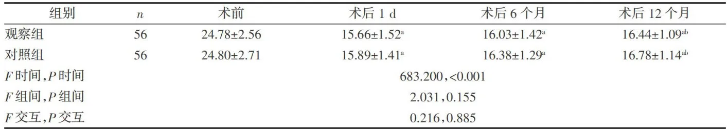 2.2两组疼痛VAS评分比较两组疼痛VAS评分比较存在时间、组间交互效应 Plt;0.05 )。两组术前VAS评分比较,差异无统计学意义( Pgt;0.05 )。术后3、6、12个月,两组VAS评分均低于术前,随着术后时间延长,两组VAS评分呈下降趋势,且观察组术后3、6个月VAS评分低于对照组(均 Plt;0.05 。见表2。
