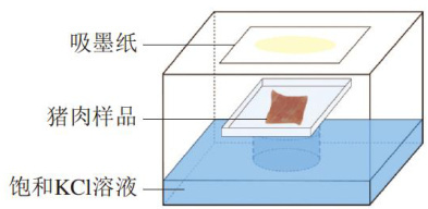 参考Choi[17]、Lee[18]等的方法,如图1所示,使用立方体处理容器( 1.5L , 21cm×14.5cm×8cm) ,将吸墨纸贴在容器盖子内侧,用于吸附抑菌剂,添加 150mL 饱和KCI溶液至容器底部, 25°C 孵育 24h ,使容器的相对湿度达 85% 左右,样品放置架位于容器中部。