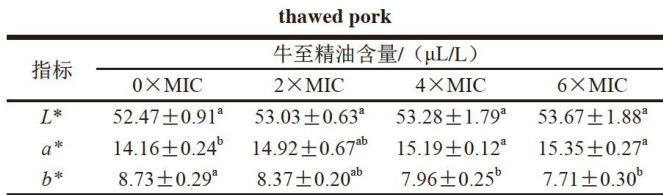 表3牛至精油气相熏蒸对解冻猪肉色泽的影响 Table3 Effectoforeganoessentialoil fumigationonthecolorof