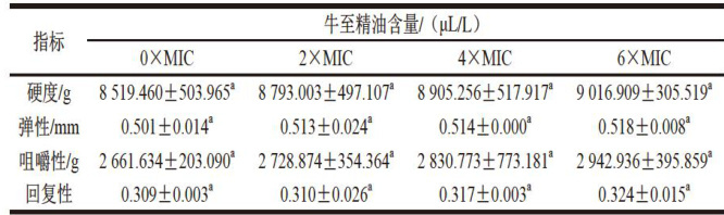 表4牛至精油气相熏蒸对解冻猪肉质构特性的影响 Table4 Effect of oregano essential oil fumigation on the texture propertiesofthawedpork