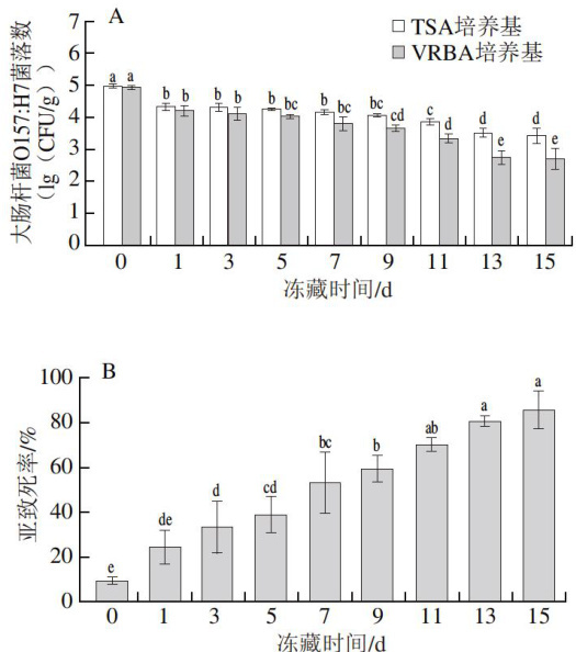 图3 冻藏时间对猪肉中大肠杆菌O157:H7菌落数 (A)和亚致死率(B) 的影响(初始菌落数4.98(lg (CFU/g) )) Fig.3Effectsoffreezing timeontheviablecount(A)and sublethal rate(B)of E. coli O157:H7 inoculated at 4.98 (lg (CFU/g) topork