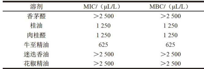 2.2 不同植物源抑菌剂气相熏蒸对大肠杆菌O157:H7的MIC和MBC