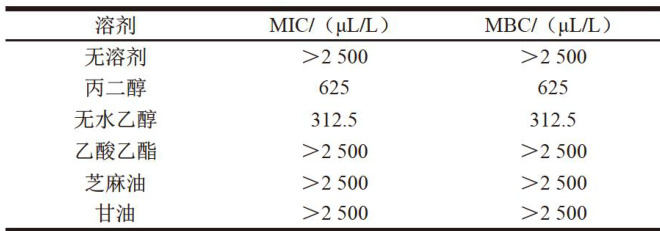 根据抑菌效果确定最佳植物源抑菌剂,以无菌水为空白对照,分别使用不同溶剂进行溶解,使抑菌剂终含量分别为0、156.3、312.5、625、1250、 2500μL/L 。然后采用相同方法测定使用不同溶剂溶解抑菌剂对大肠杆菌O157:H7的MIC和MBC,确定最佳溶剂。