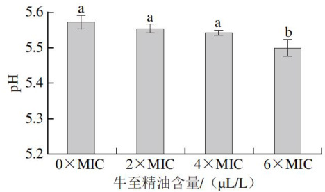 图6牛至精油气相熏蒸对解冻猪肉pH值的影响 Fig. 6 Effectoforeganoessentialoil fumigationonthepHofthawedpork