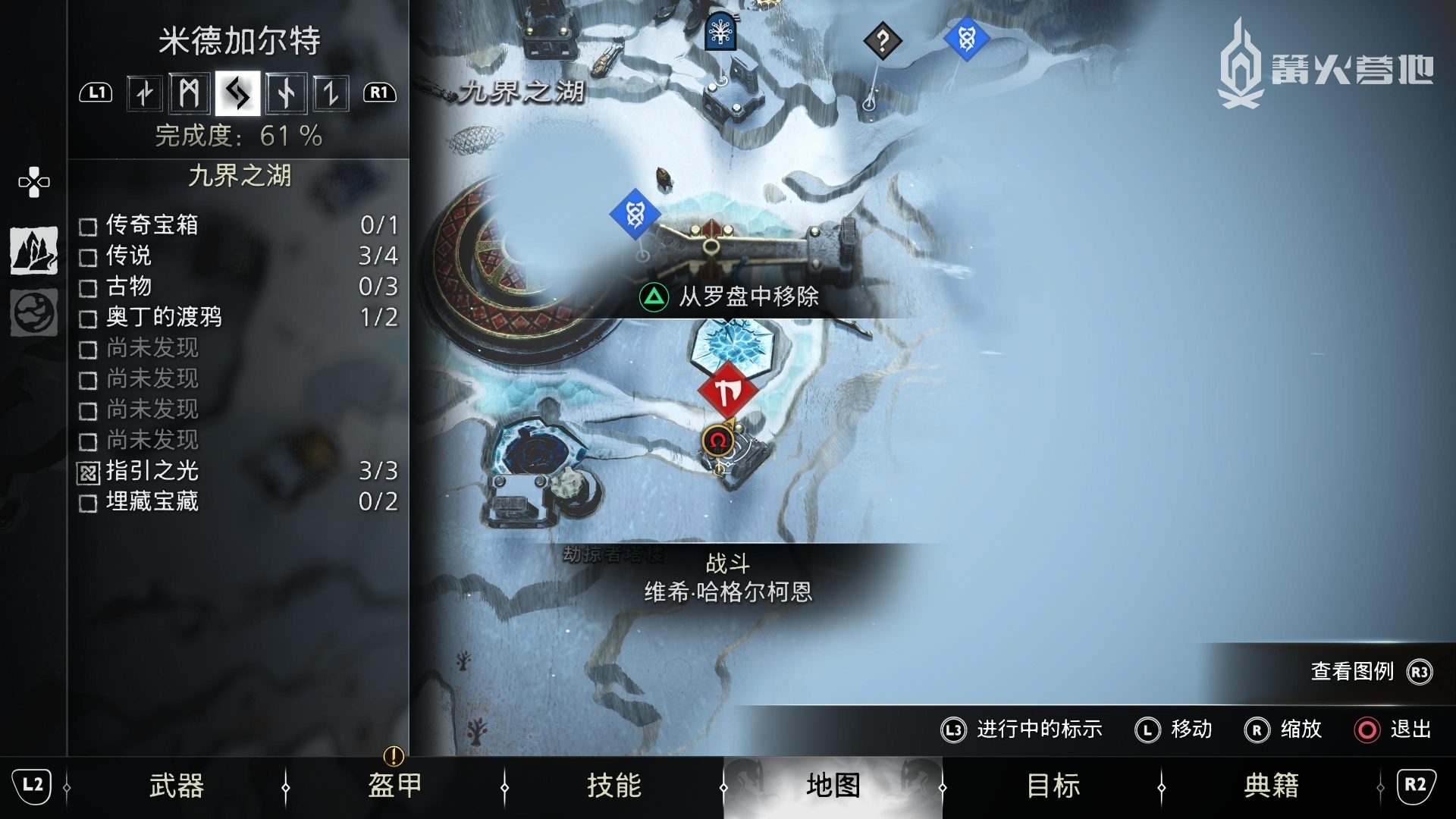 在「米德加尔特 - 九界之湖」,下图位置可以与 Boss「维希·哈格尔柯恩」交战,获得「护身符附魔 - 约顿海姆荣誉」。