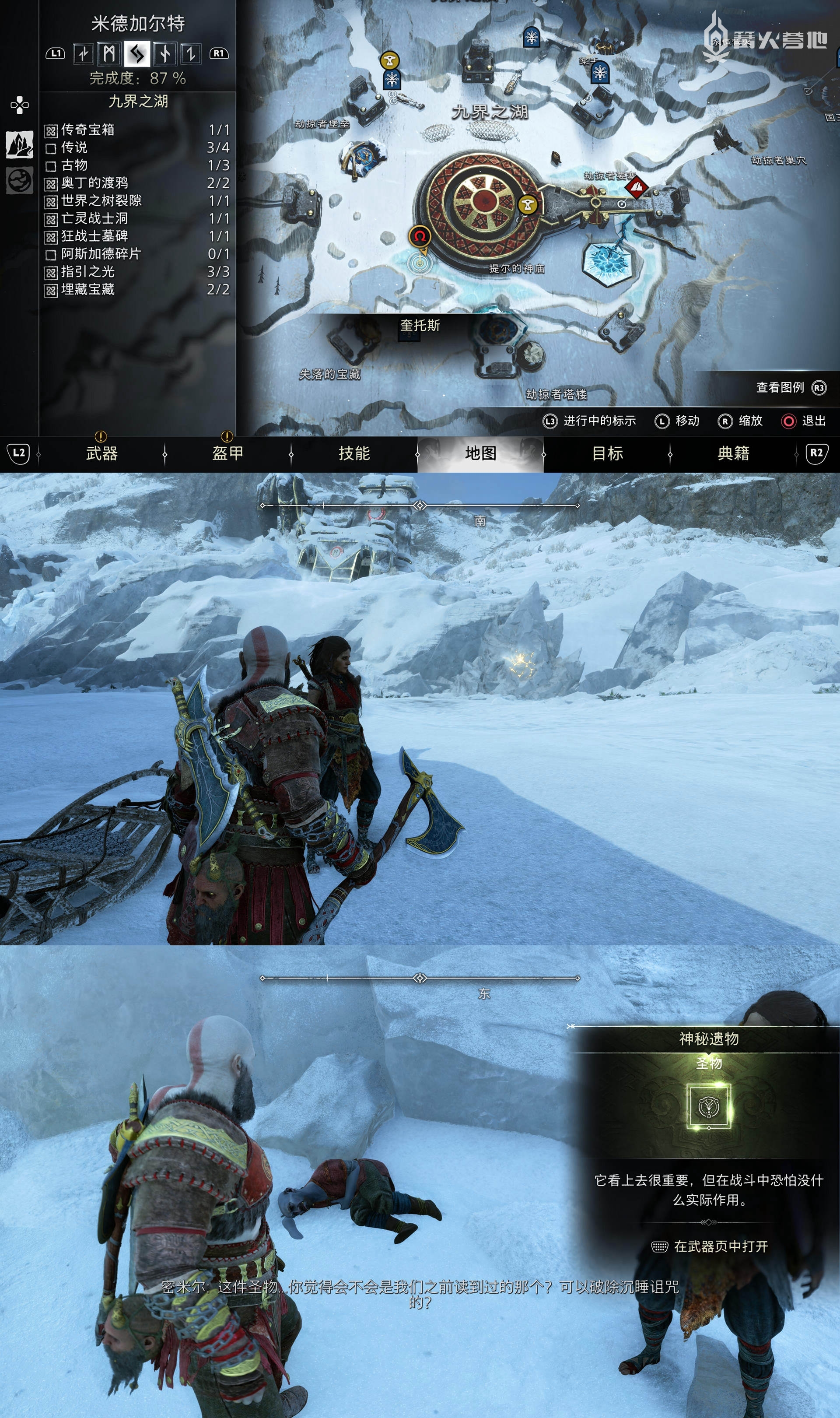 想要唤醒四个隐藏山怪,要先在主线中获得长矛后,在「米德加尔特 - 九界之湖」,用长矛引爆下图的冰块,可以拿到「圣物 - 神秘遗物」。