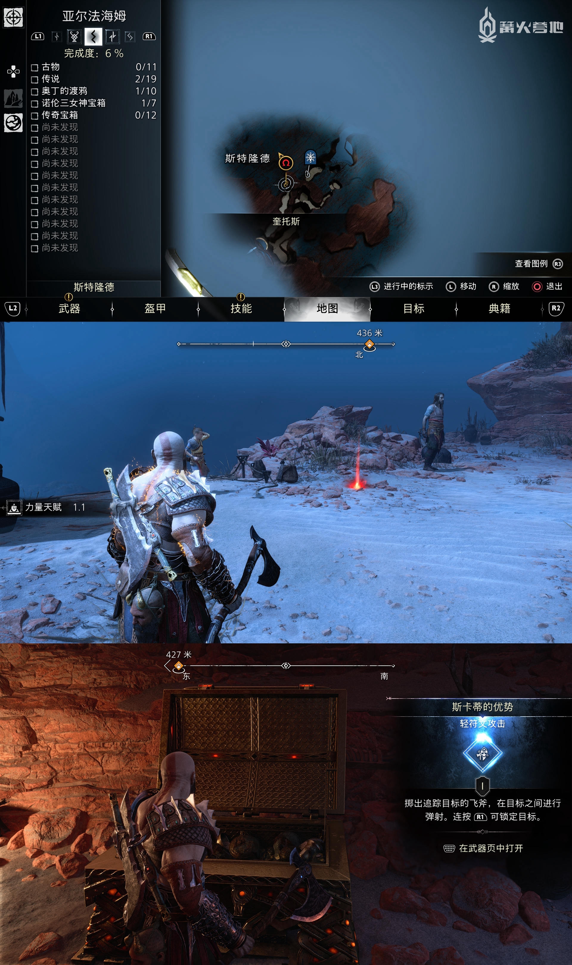 在「亚尔法海姆 - 斯特隆德」,从下图位置的左边跳下去,左转走到尽头能看到传奇宝箱,打开获得「轻符文攻击 - 斯卡蒂的优势」。