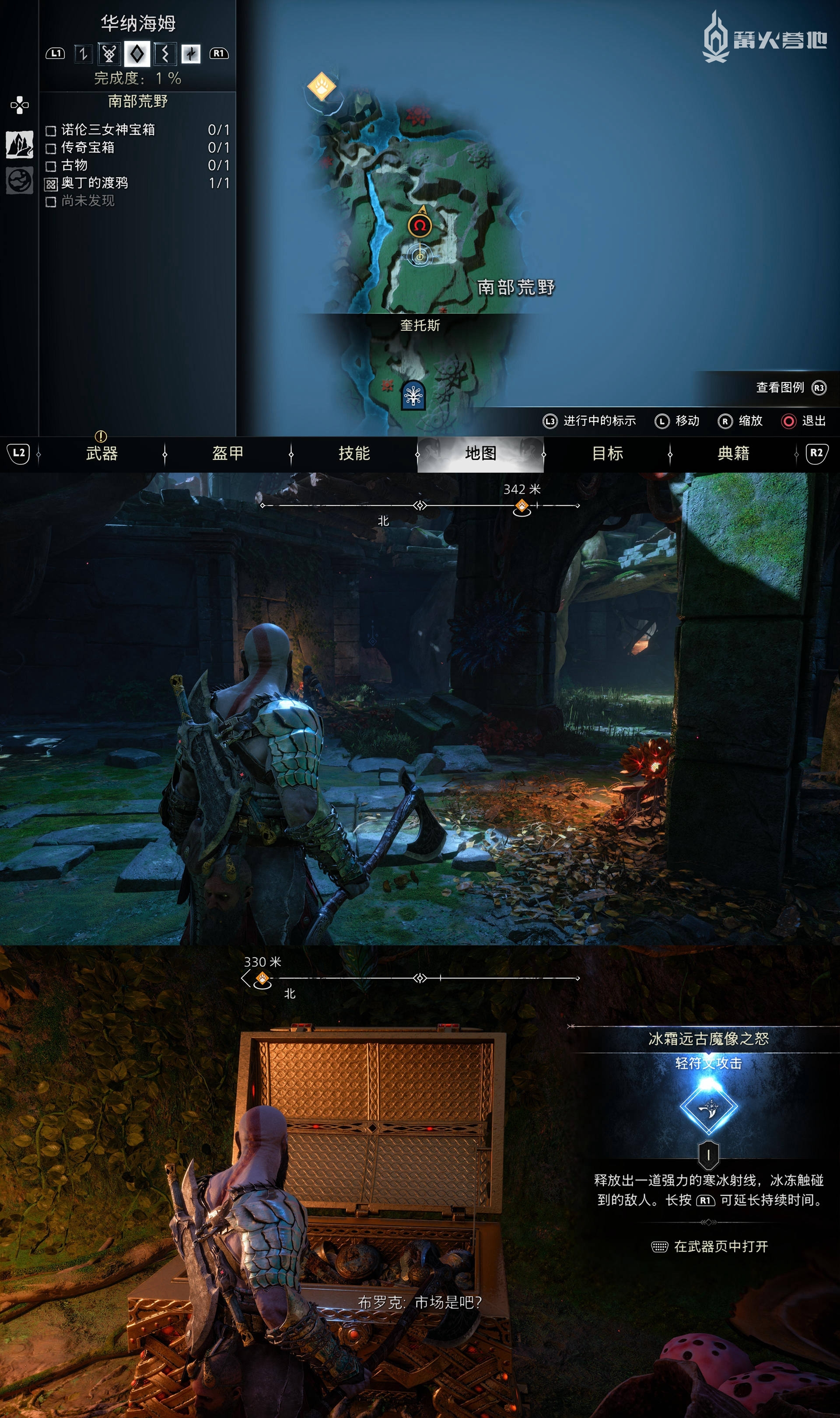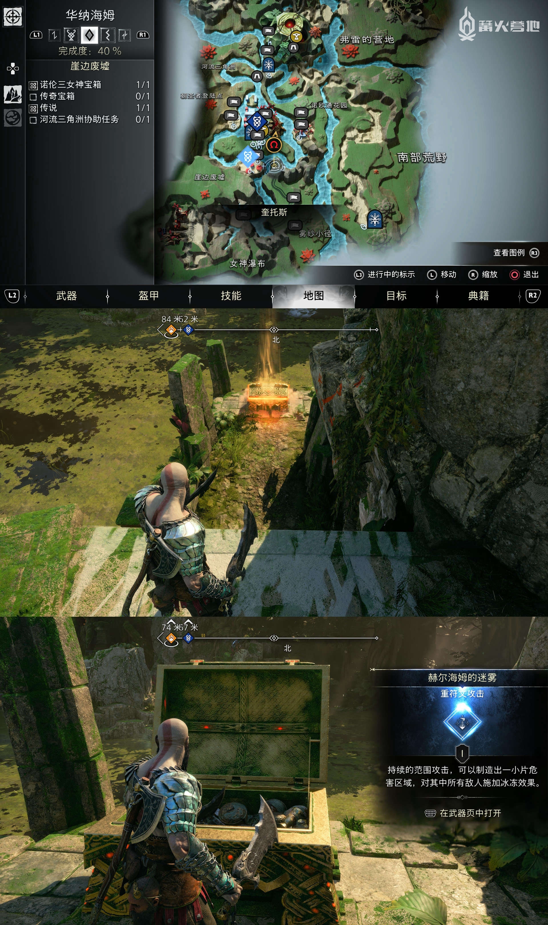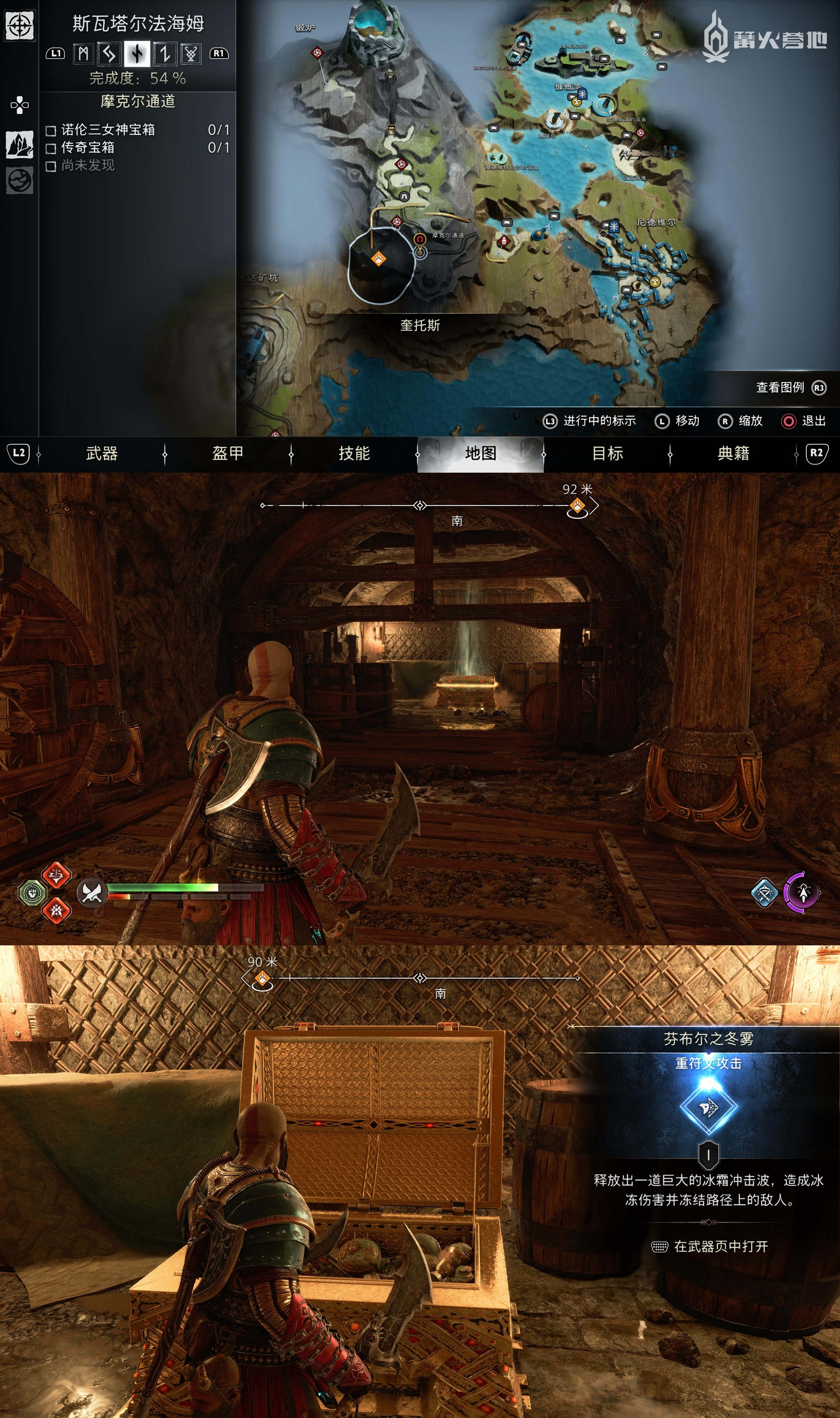 在「斯瓦塔尔法海姆 - 摩克尔通道」,需要同时冻住两个装置走廊另一头,烧掉红色植物能看到「传奇宝箱」,获得「重符文攻击 - 芬布尔之冬雾」。
