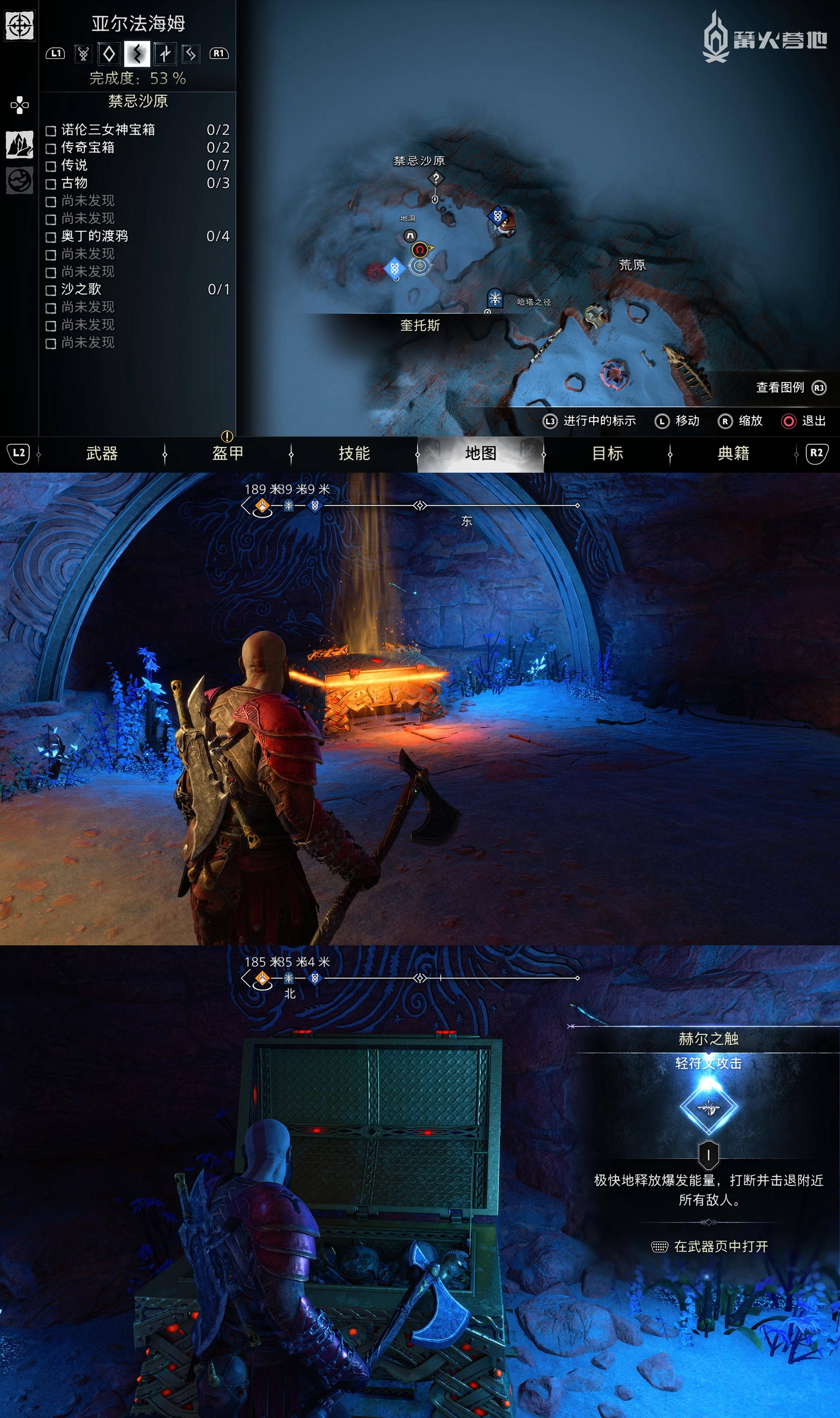 在「亚尔法海姆 - 地洞」(地图显示是禁忌沙原,但东西是属于地洞范围的),经过在墙边用锁链多次蹬墙,下图位置可以找到「传奇宝箱」,获得「轻符文攻击 - 赫尔之触」。