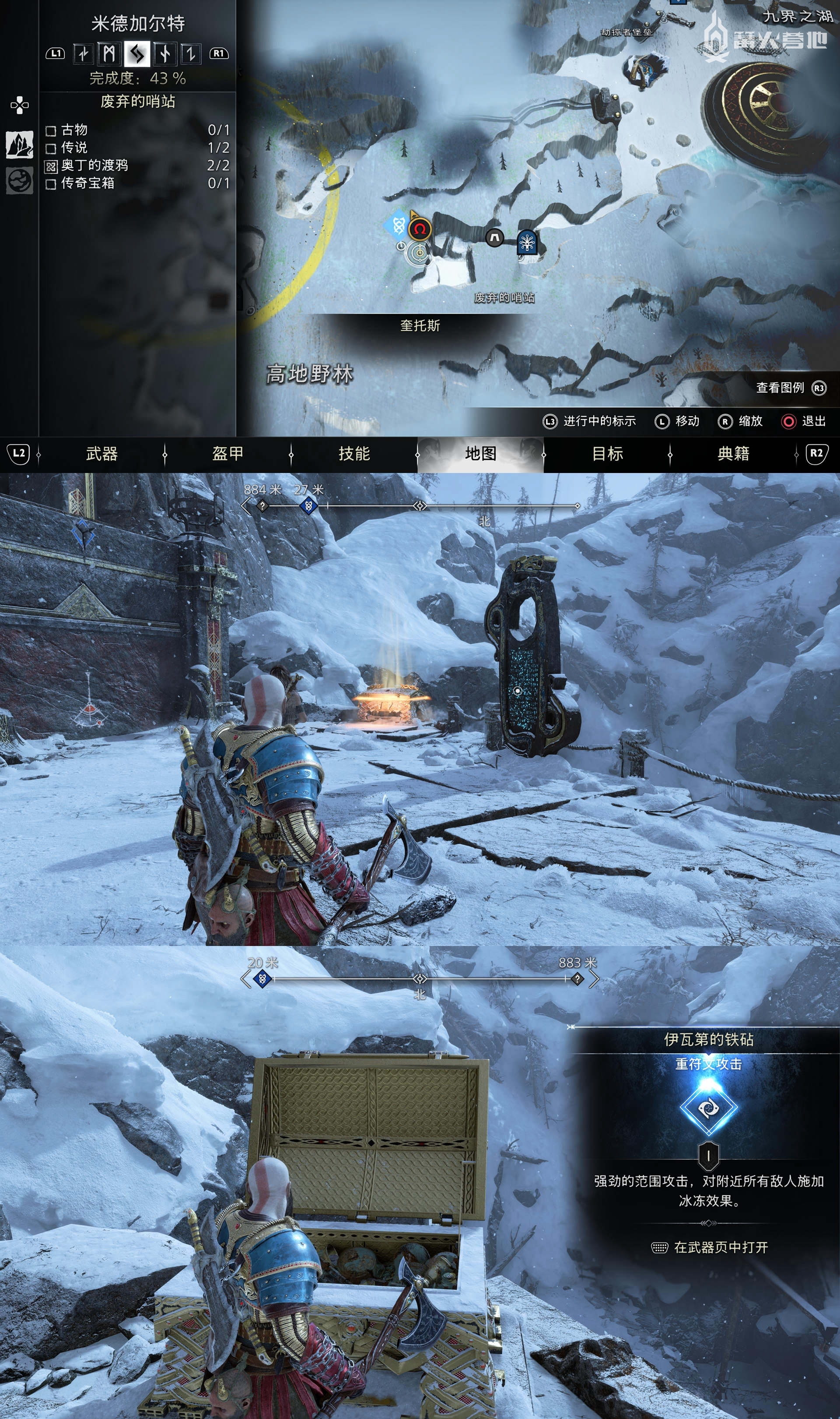 在「米德尔加特 - 废弃的哨站」,下图位置可以找到「传奇宝箱」,获得「重符文攻击 - 伊瓦第的铁砧」。