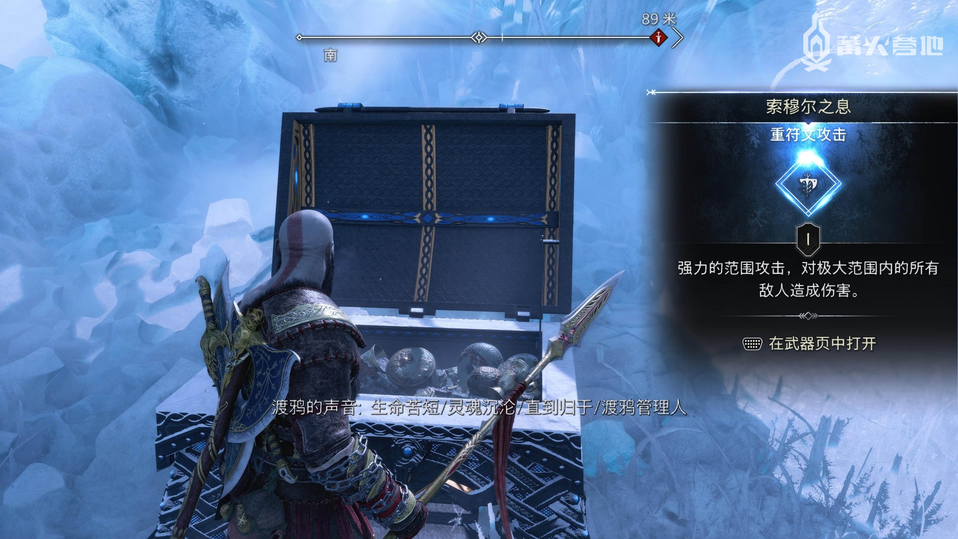 在「尼福尔海姆 - 渡鸦树」,收集渡鸦开启「传奇宝箱」可以获得「重符文攻击 - 索穆尔之息」。