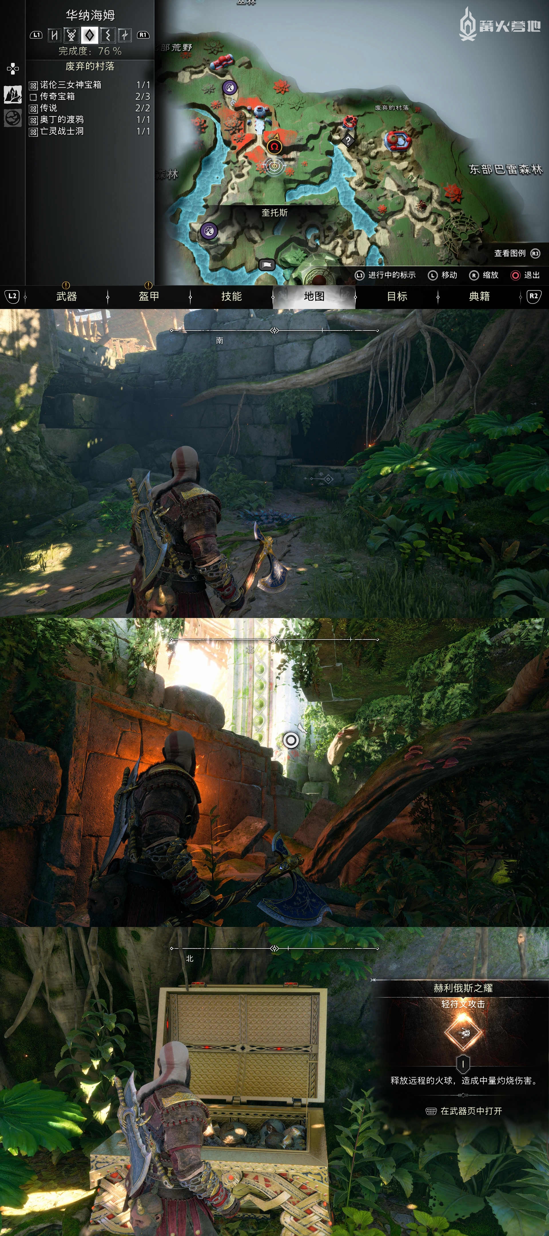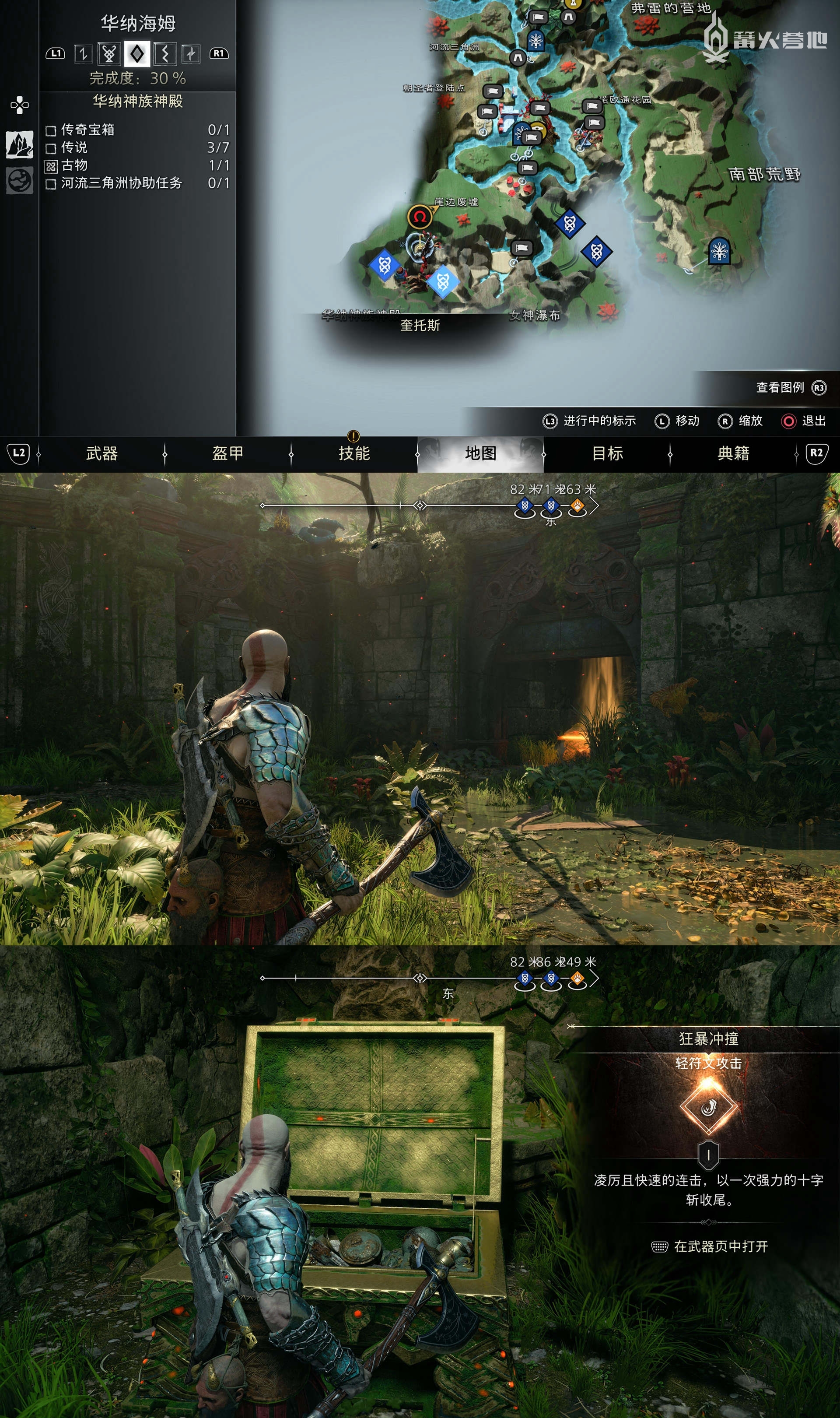 在「华纳海姆 - 华纳神族神殿」,下图位置可以找到「传奇宝箱」,不过首先要先上一层,点燃植物后用斧头击碎连接装置打开大门,可以获得「轻符文攻击 - 狂暴冲撞」。