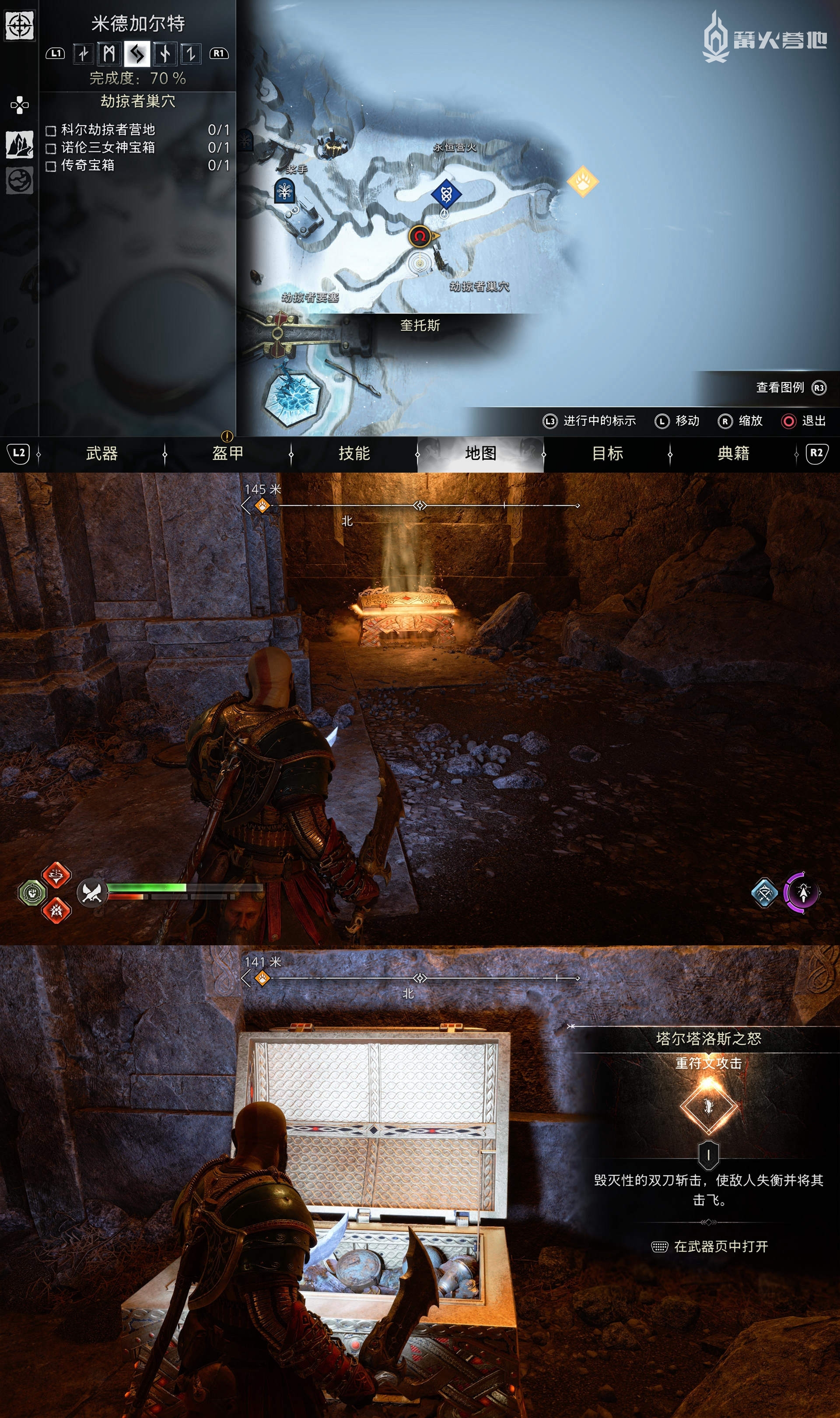 在「米德加尔特 - 劫掠者巢穴」,可以找到「传奇宝箱」,可以获得「重符文攻击 - 塔尔塔罗斯之怒」。