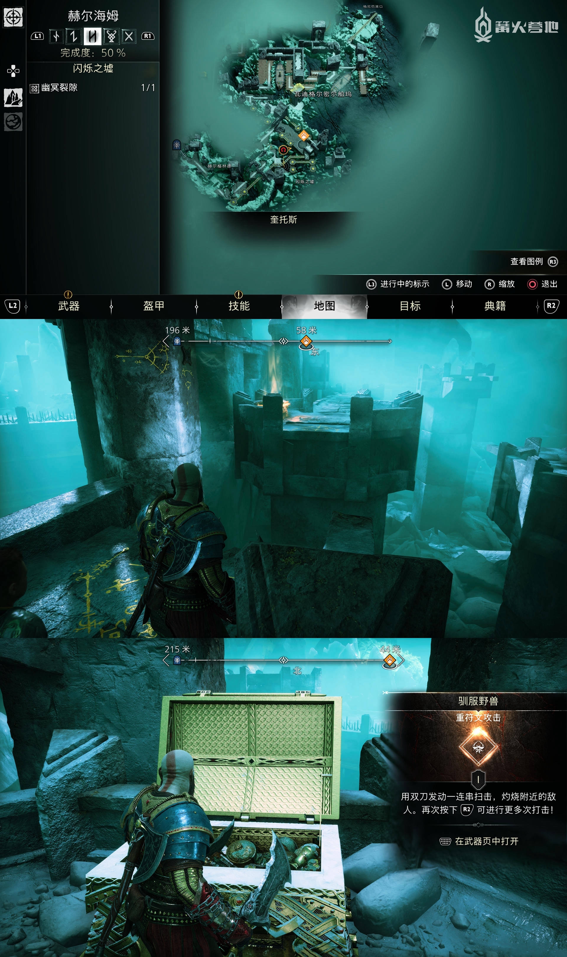在「赫尔海姆 - 闪烁之墟」,下图位置可以找到「传奇宝箱」,打开获得「重符文攻击 - 驯服野兽」。