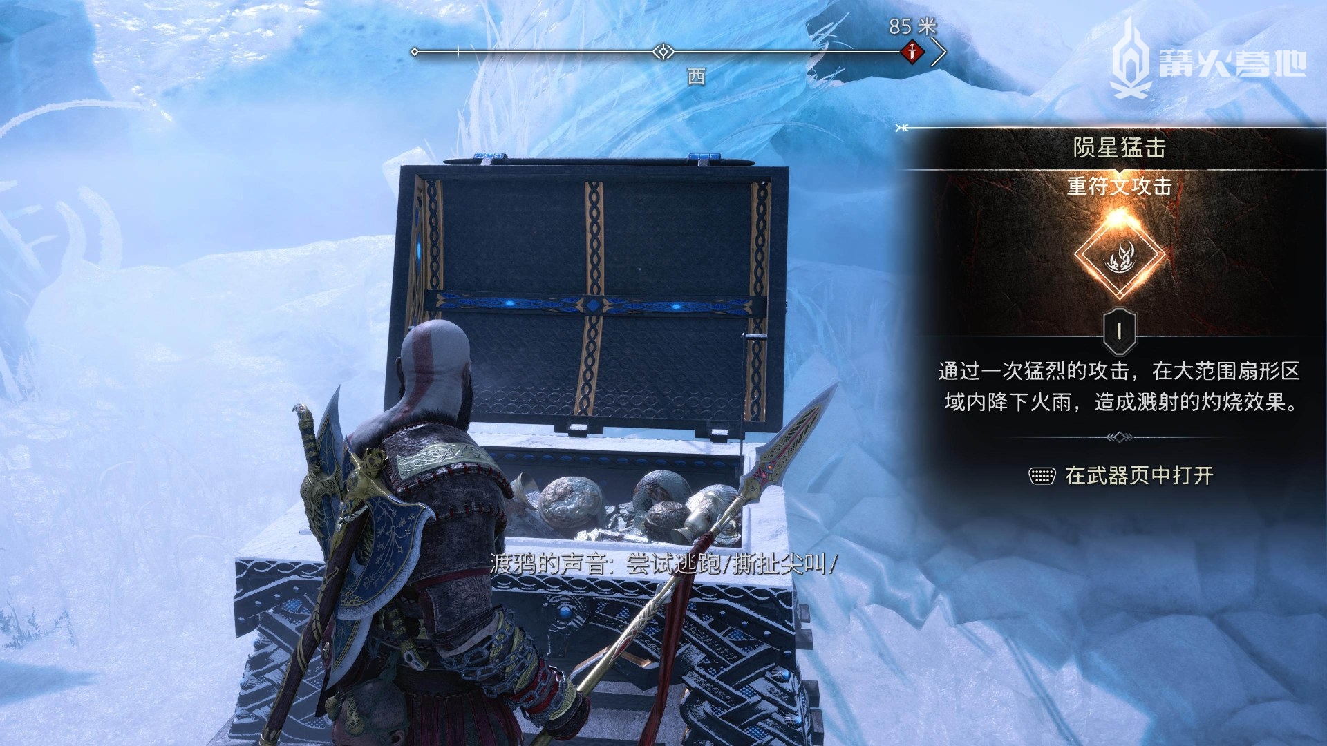 在「尼福尔海姆 - 渡鸦树」,收集渡鸦开启「传奇宝箱」可以获得「重符文攻击 - 陨星猛击」。