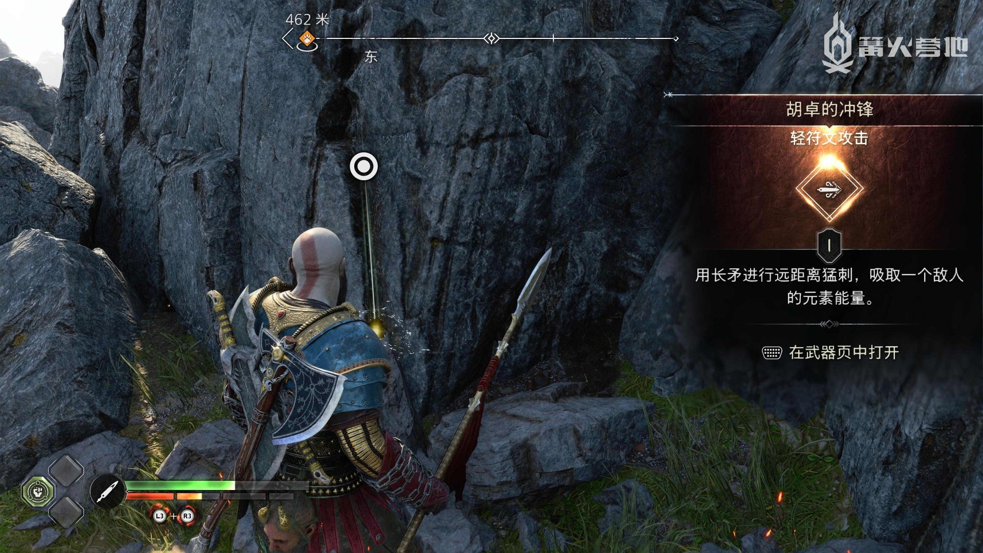 在「华纳海姆 - 东部巴雷森林」,在下图位置用长矛打爆岩石,可以找到「传奇宝箱」,获得「重符文攻击 - 利维坦的咆哮」。