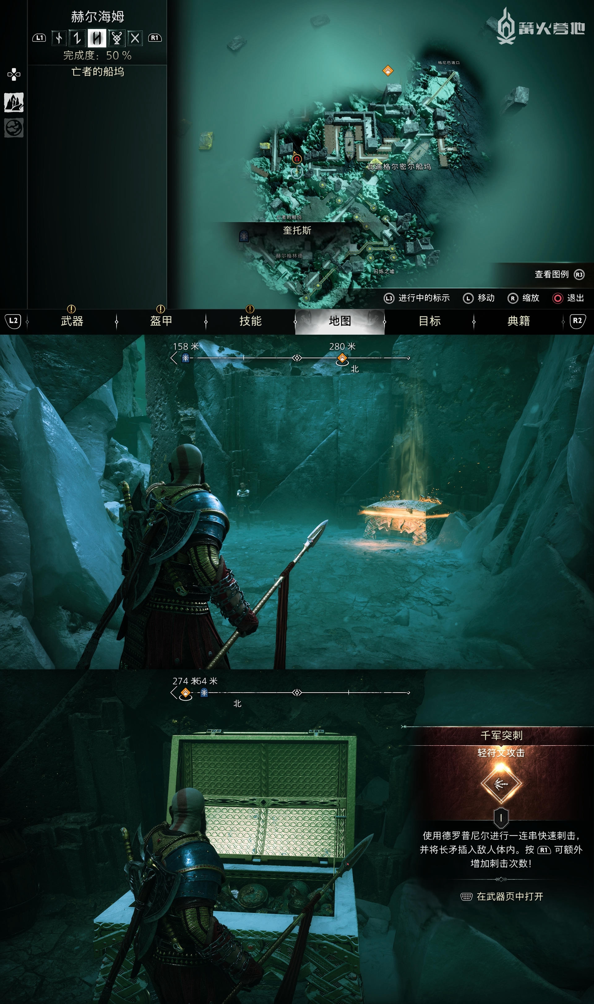 在「赫尔海姆 - 亡者的船坞」,下图位置可以找到「传奇宝箱」,打开获得「轻符文攻击 - 千军突刺」。