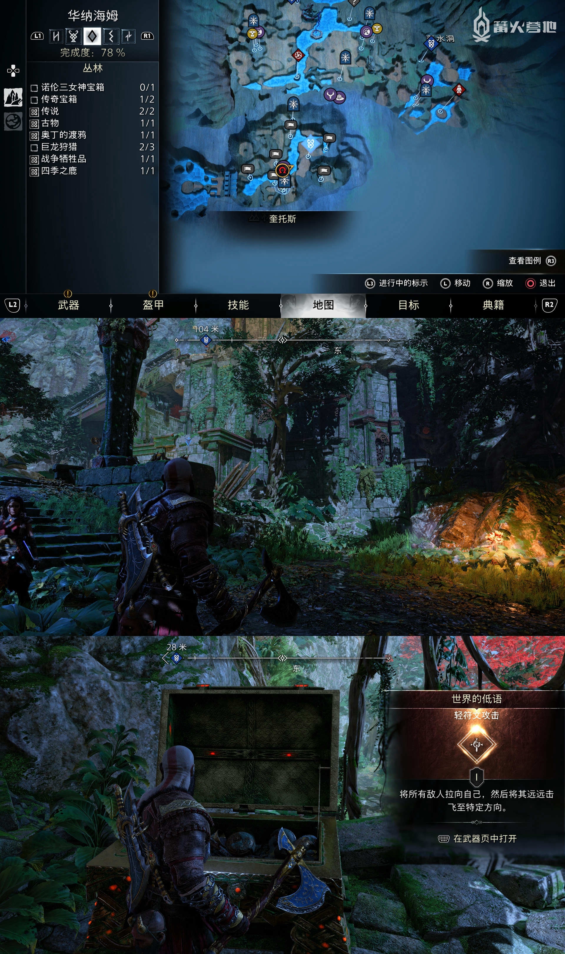在「华纳海姆 - 丛林」,从天体圣坛旁边的平台右边跳下去,一路绕到后方会看到「传奇宝箱」,可以获得「轻符文攻击 - 世界的低语」。